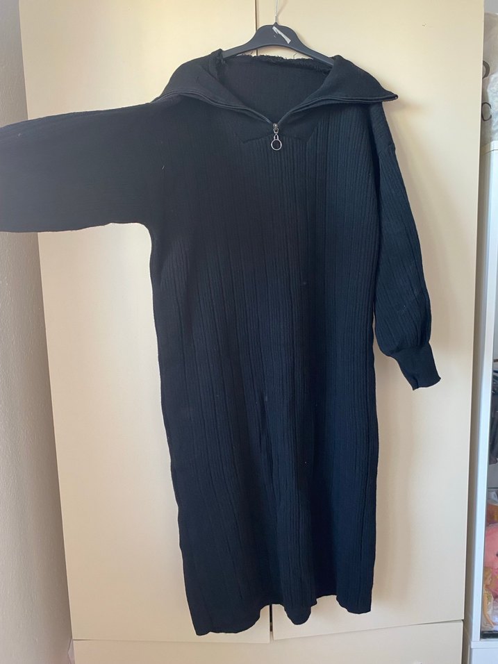 Yüksek yakalı fermuarlı, uzun kollu, siyah örgü uzun elbise. Sentetik kumaştan, bol kesim, günlük kullanım ve sokak modasına uygun.