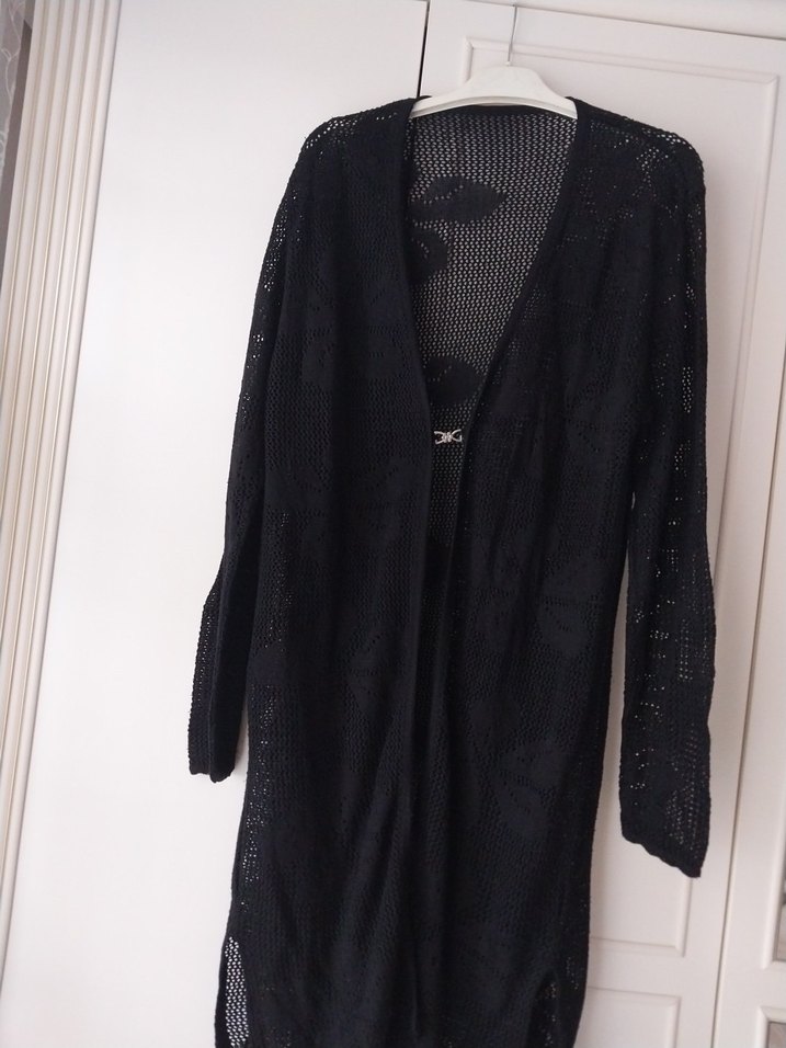 Uzun, bol kesim siyah hırka örgü dokusu ve yaka detayıyla rahat ve şık goth tarzı sunar.