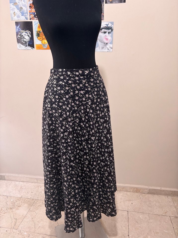 Uzun siyah papatya desen etek hafif kloş kesim kemerli ve astarlı s-m beden uyumlu kendi tasarımım hiç giyilmedi