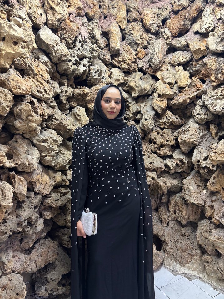 Uzun siyah abiye, yüksek yakalı ve uzun kollu olup, pelerinli ve desenli detaylara sahiptir. Düzenli kesimiyle mütevazı ve gösterişli tarzlara uygundur.