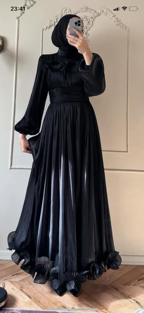 Uzun siyah abiye elbise, pileli etek, bol kesim ve tekne yaka detaylarına sahiptir. Hiç giyilmedi etiketiyle durmaktadır. 40 bedene uyumludur.