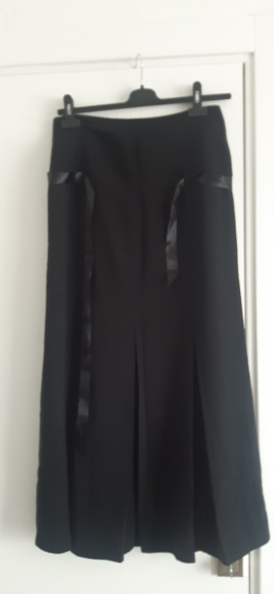 Uzun siyah pileli etek, ipeksi dokusu ve gotik tarzıyla ofis için şık ve avant-garde bir görünüm sunar. astarlı, yandan fermuarlı