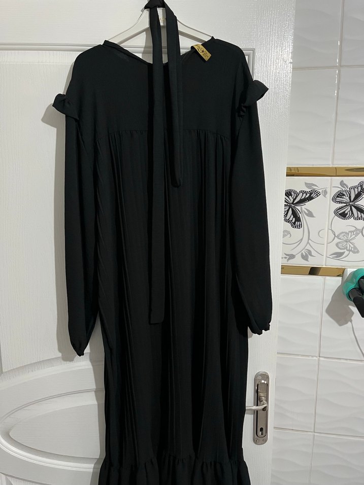Uzun siyah elbise, pilili detaylara, uzun kollara ve yüksek yakaya sahiptir. Gevşek kesimli, goth tarzında ve sentetik kumaştan üretilmiştir. Günlük kullanım için uygundur.