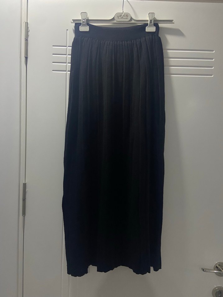 Uzun siyah pilili etek, bol kesim ve düz desensizdir. Sentetik yumuşak kumaştan yapılmıştır ve günlük kullanıma uygundur.