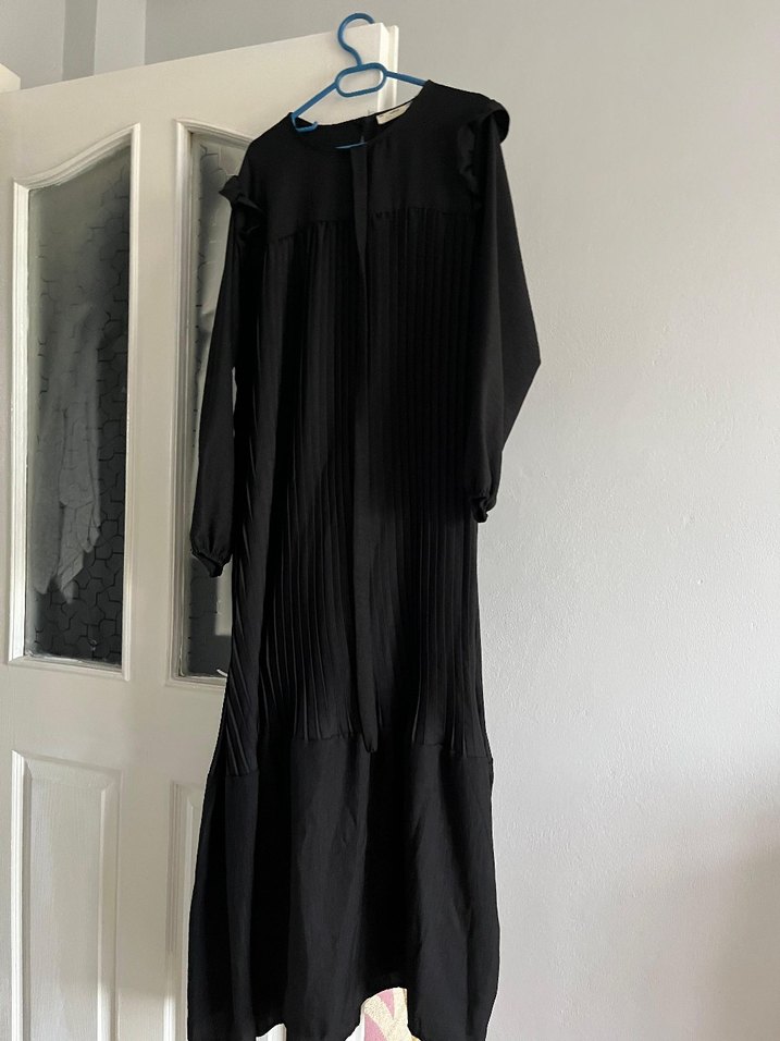 Uzun siyah keten elbise, piliseli detaylara, yüksek yakaya ve uzun kollara sahiptir. Bol kesim ve gotik tarzıyla günlük kullanıma uygundur.