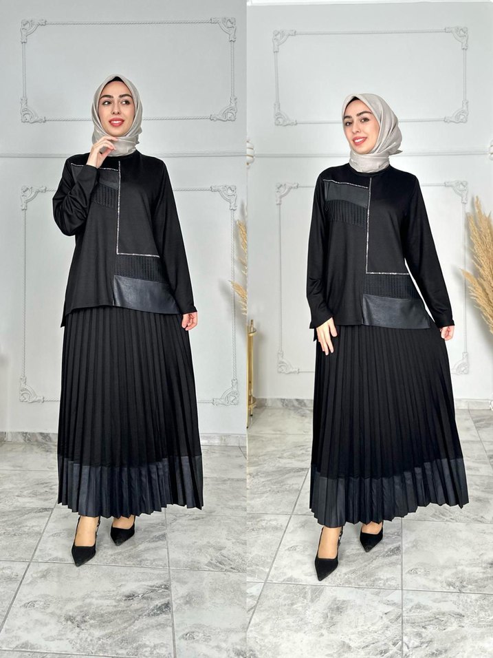 Bu mütevazı uzun siyah elbise, piliseli etek ve uzun kollu, yuvarlak yakalı tasarıma sahiptir. Sentetik kumaştan yapılmış, günlük kullanım için uygundur ve gotik normcore tarzındadır.