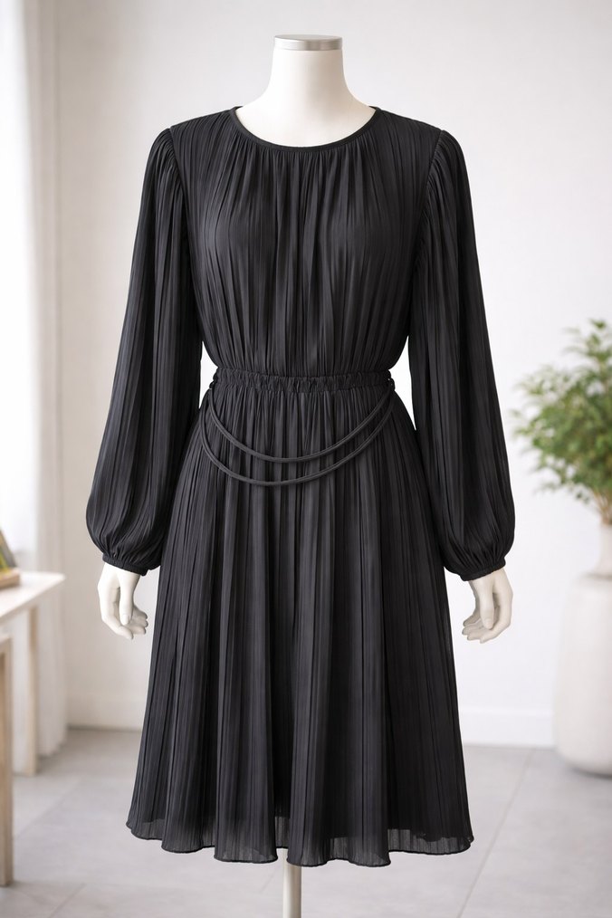 Uzun siyah elbise, piliseli detaylı, yuvarlak yaka ve bol kesimlidir. Uzun kollu ve belde ince bağcık bulunur, ofis kullanımı için uygundur.