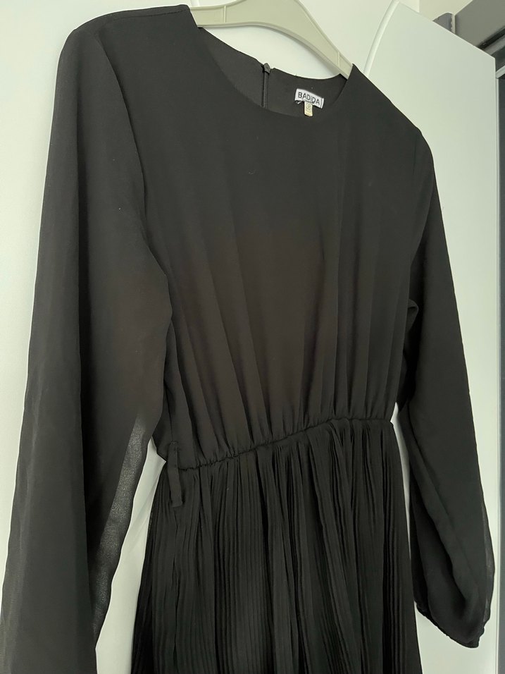 Siyah uzun elbise, piliseli etek, salaş kesim, askılı kollu ve yuvarlak yakalı, yumuşak sentetik kumaştan. Ofis için minimalist gotik tarzda uygun.