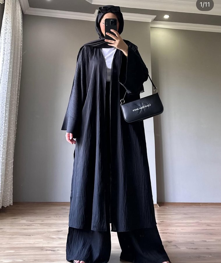 Uzun siyah kadın kimonosu, pliseli keten kumaştan ve bol kesimlidir. Askılı kolları ve çentikli yaka detayıyla günlük ve sade tarz için uygundur. Kimono takim 52 beden