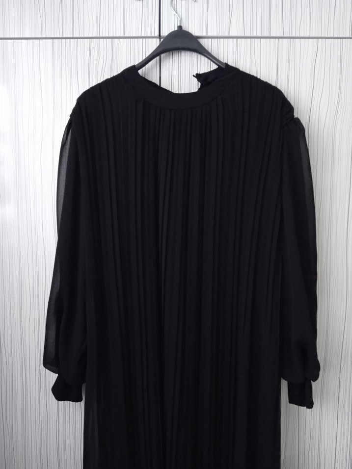 Uzun siyah şifon elbise, pliseli detayları, yüksek yakası ve uzun kollarıyla minimalist gotik tarzda, rahat kesimlidir. hiç bir kusuru yoktur bir kez giyildi