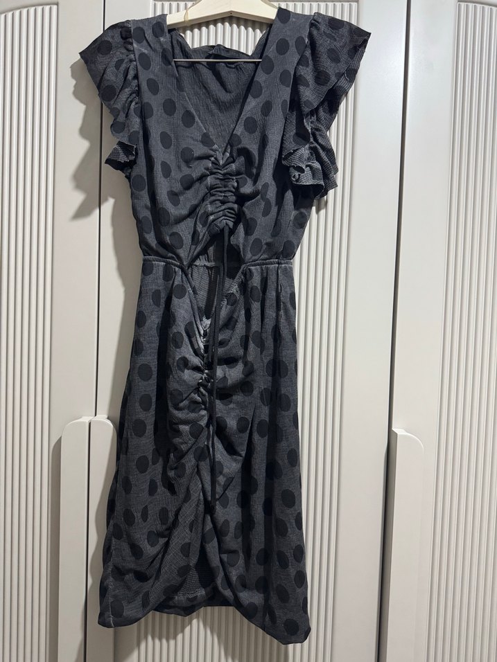 Uzun Siyah Puantiyeli Fırfırlı Elbise