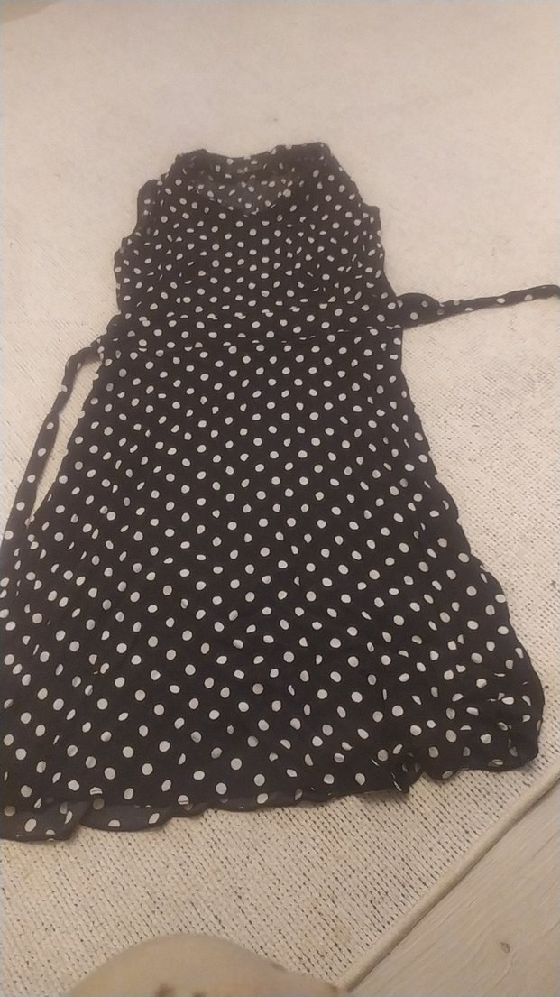 V yaka ve askılı, beyaz puantiyeli uzun siyah elbise, fırfır detaylı, günlük kullanıma uygun şık bir model.
