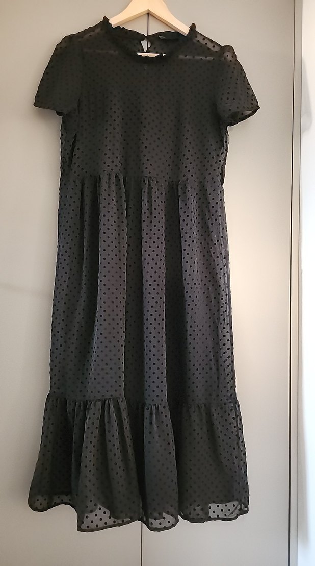 Yüksek yakalı, askılı kollu, bol kesim siyah uzun elbise. Puantiyeli deseni ve fırfır detaylarıyla günlük kullanıma uygundur. İçi astar üzer tül puantiyeli elbise 1 kez kullanıldı