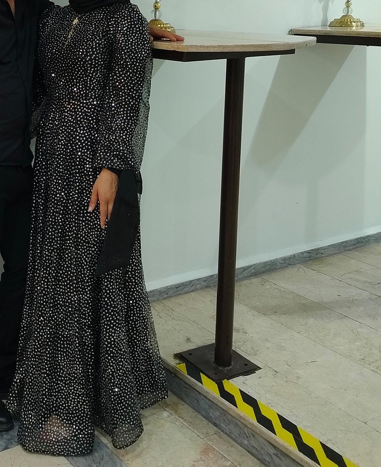 Yüksek yakalı, askılı ve puantiyeli desenli, drapeli uzun siyah abiye elbise, düğün için uygun şık bir seçim. ,38-42 uyumlu, bir kere giyildi temiz ürün