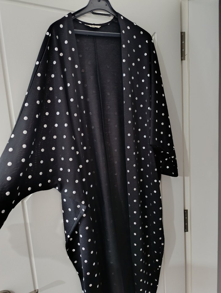 Uzun, siyah puantiyeli, dökümlü ve bol kesim kadın kimono. Notlu yaka ve uzun kolludur, günlük sokak stili için uygundur.