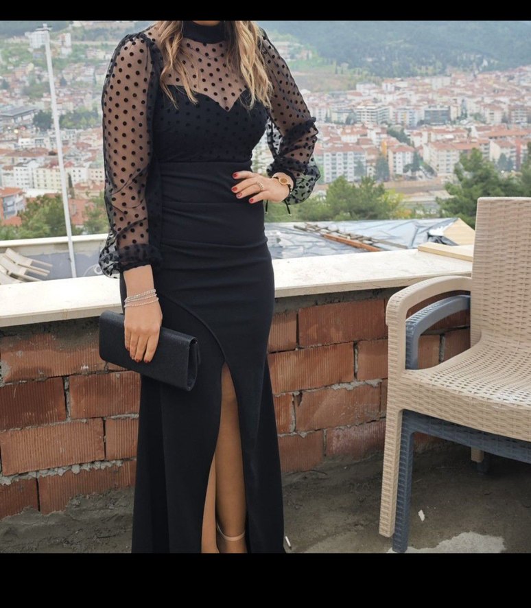 Uzun siyah elbise, v yaka ve puantiyeli şeffaf uzun kollara sahiptir. Drapeli tasarım ve yırtmaç detayıyla romantik akşamlar için uygundur.