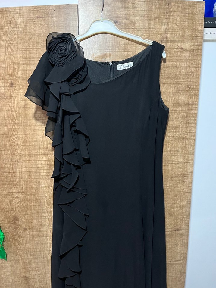 Siyah uzun kalın askılı tek kolu çiçek işlemeli fırfırlı şık elbise büyük beden