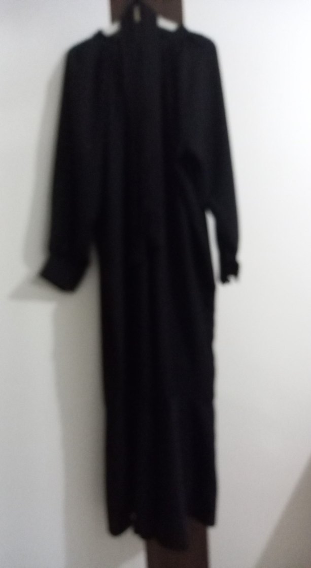 Uzun siyah elbise, salaş kesim ve drapeli tasarıma sahiptir. Notlu yaka ve uzun kolludur, yumuşak ve sıcak kumaştan üretilmiştir.