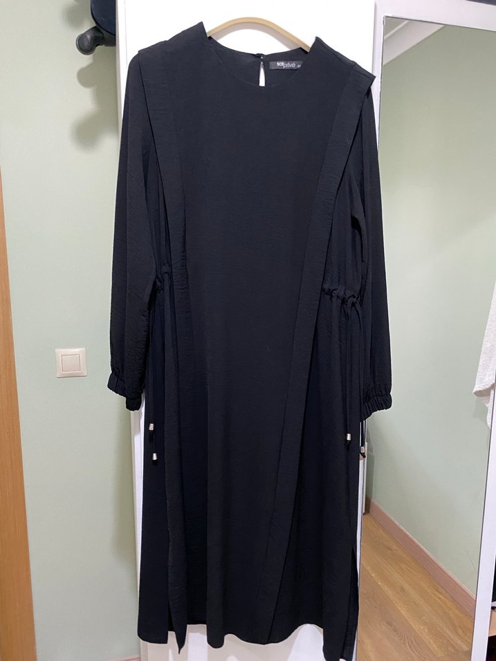 Uzun siyah elbise, salaş kesim ve drapeli detaylara sahiptir. Uzun kollu, yüksek yakalı ve sentetik kumaştandır. Minimalist ofis stiline uygundur.