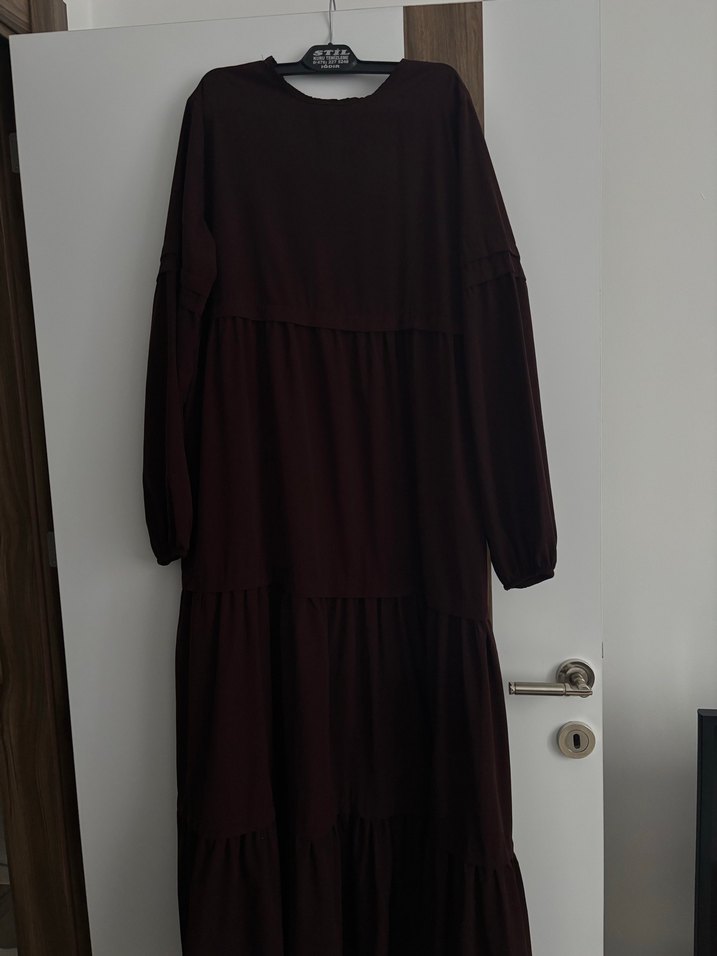 Uzun siyah kadın elbise, salaş kesim, drapeli detaylar ve uzun kolludur. Yuvarlak yaka ve sade, mütevazı stile sahiptir, yumuşak sentetik kumaştandır. 38-40 bedene olur temizdir sayılı giyildi rengi koyu kahverengi. Feracedir