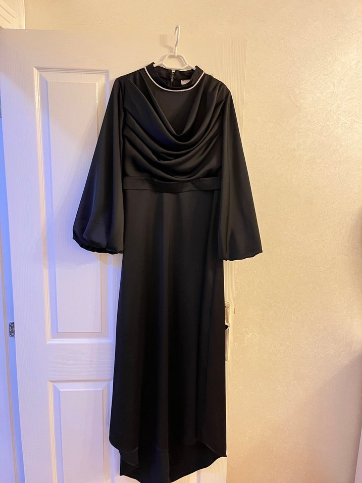 Yüksek yakalı, drapeli ipeksi kumaş ve uzun kollu, bol kesim uzun siyah elbise, taş detaylı tarzda ofis için uygun.