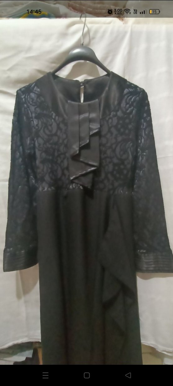 Uzun siyah saten elbise, yüksek yakalı ve uzun kolludur. Desenli sentetik kumaştan yapılmış, özel günler için uygundur. göğüs altında ekstra şifon bi parçası var,göbek saklamak için çok iyi