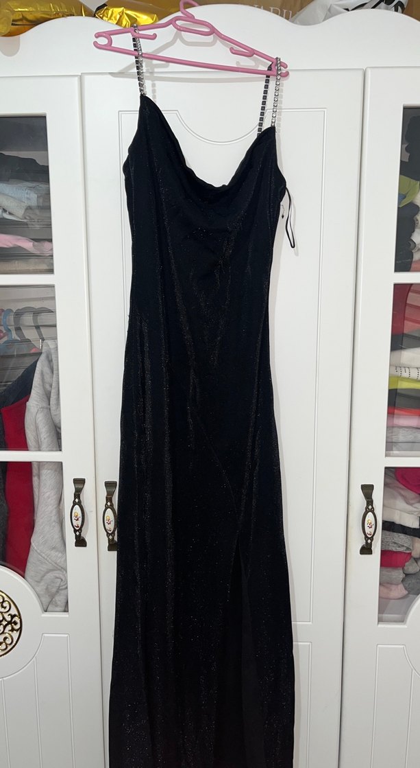 Simli Drapeli ve askılı uzun siyah elbise, vücuda oturan kesimiyle romantik geceye uygun gotik şıklık sunar.