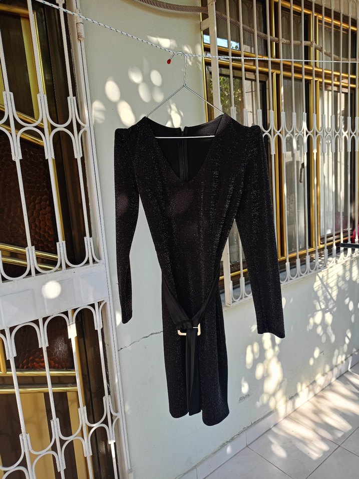 Uzun Siyah simli V Yaka Kemerli Abiye Elbise