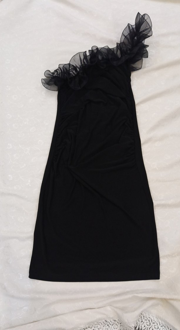 Dar kesim, uzun siyah abiye elbise, straplez yaka ve drapeli detaylara sahip, gotik parti stiline uygun. ürün 3 numara olarak beden gözüküyor buzi kumaş esnek s_m-l gbi olabilir