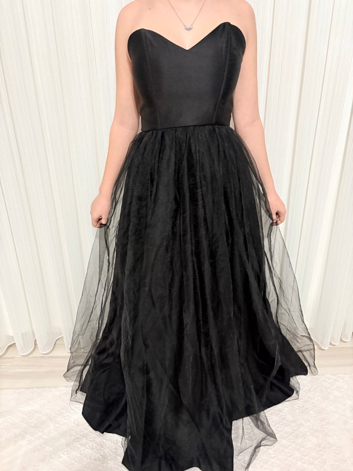 Siyah, straplez, vücuda oturan uzun abiye elbise, drapeli etek detayına sahip. Gotik tarzda, düğünler için uygun, kolsuz model.