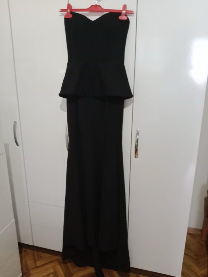 Uzun siyah straplez abiye elbise, dökümlü tasarımı ve kolsuz, rahat kesimiyle gotik stil sunar.