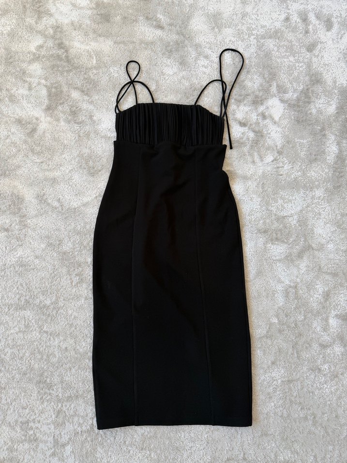 Siyah, uzun ve dar kesimli bu gece elbisesi, straplez yaka,sırt dekolteli ve drapeli detaylara sahip, gotik tarzıyla romantik akşamlar için uygundur. #siyah #siyahelbise #midielbise