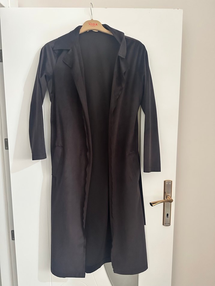 Uzun siyah süet ceket, kesik yaka ve drapeli tasarımıyla regular fit sunar. Uzun kollu, gotik tarzda, iş ortamına uygun şık bir parçadır. Rengi tam siyah değil füme sanırım
