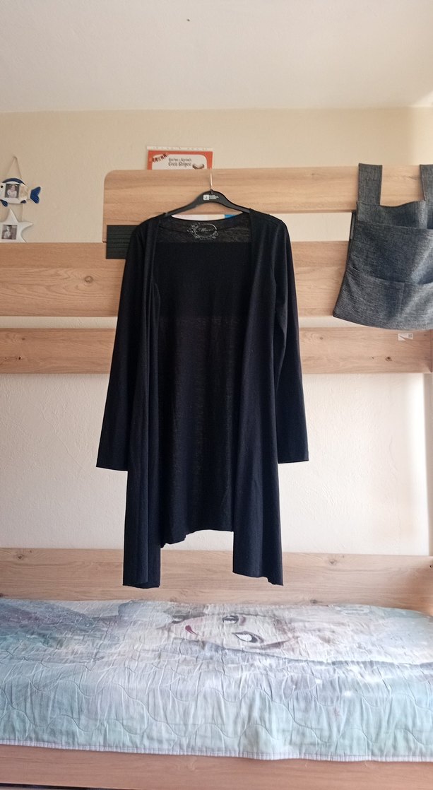 Uzun siyah süet kumaştan, salaş kesim ve drapeli tasarıma sahip hırka. Uzun kollu ve yuvarlak yaka.