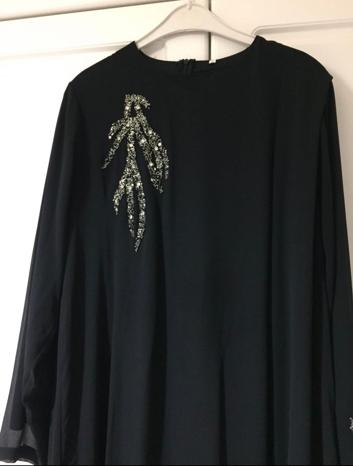 Şifon dokulu, uzun kollu ve yuvarlak yakalı, bol kesim siyah aniye tunik. Ön kısmında ve kollarında taş işlemeli detaylar ve dökümlü tasarım bulunur, astarlıdır hiçbir sıkıntısı yoktur. Çok şıktır. Boyu 108 cm iki kol arası 56 cm’dir. 42-44 bedene uyumludur.