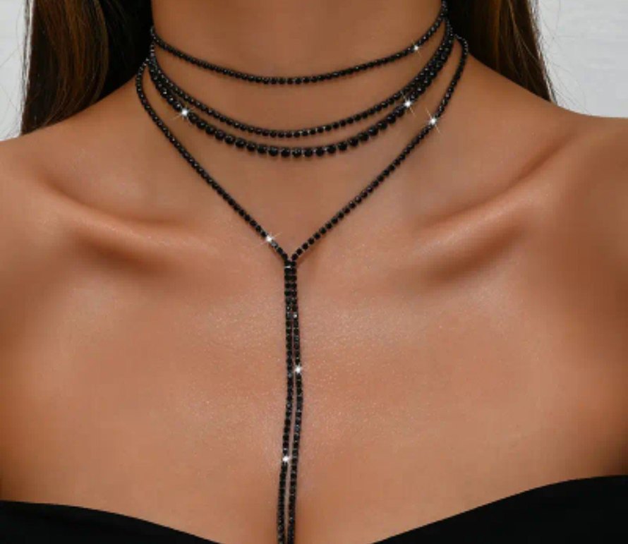 Boyunda üç sıra olan, dördüncü sırası boyundan aşağı 15 cm uzunluğunda iki sıra halinde dekolte bölgesine doğru uzanan, ışık verecek kadar parlak, göz alıcı, çok şık gotik kolye ✨ Daha önce hiç kullanılmayan kolyenin 15 cm de uzatma zinciri bulunuyor.