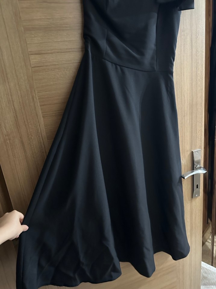 Uzun siyah gece elbisesi, tek kollu ve fiyonkludur. Üst kısmı, vücuda oturuyor üst kısmı altı Çan iniyor kusurları kapatan şık bir gece elbisesi