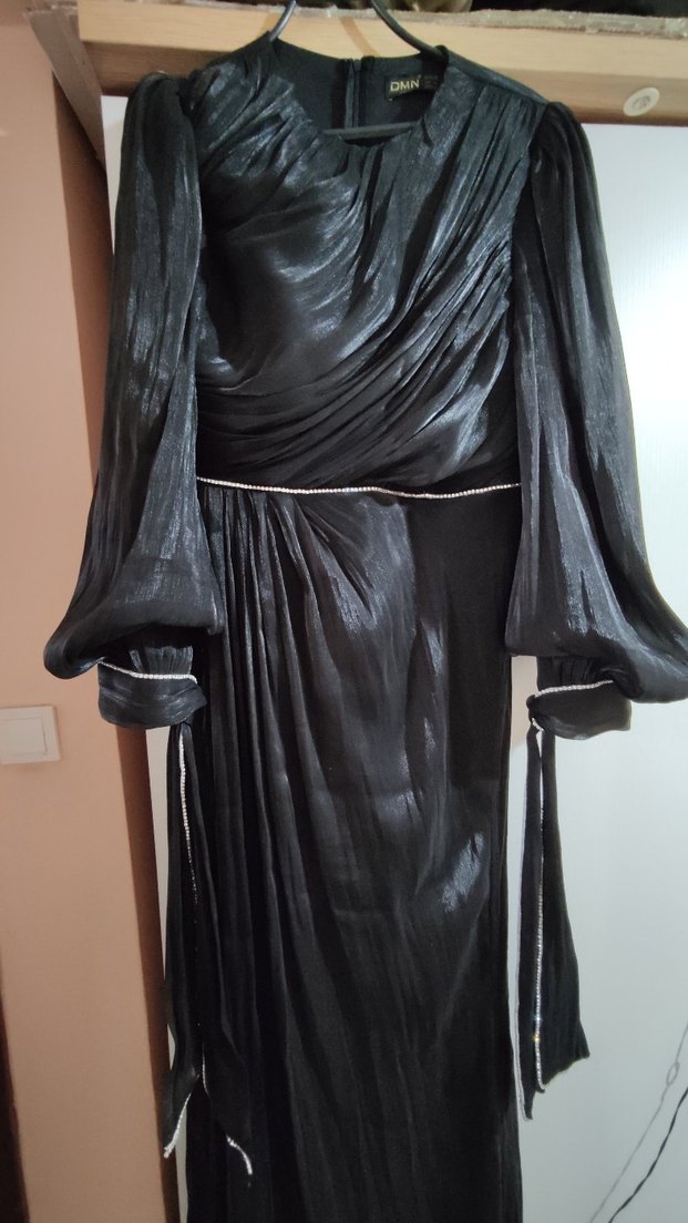 Uzun siyah gece elbisesi, yüksek yakalı ve bol kesimdir. detaylı kol ve drapeli tasarımıyla düğün ortamına uygundur.