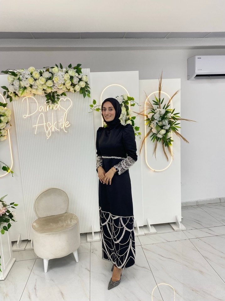 Uzun siyah tesettür elbise, yüksek yakalıdır.Drapeli detayları ve işlemeli kolları vardır. Düğün için uygundur. Özel dikim yapılmıştır beden aralığı 34-36 bedendir