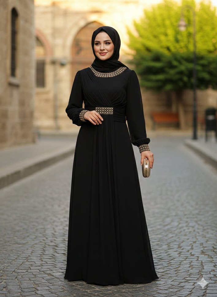 Yüksek yakalı, uzun kollu siyah abiye elbise, etnik desenli yakası, manşetleri ve kemeri ile drapeli, düzenli kesimdir. Düğünlerde kullanıma uygundur.