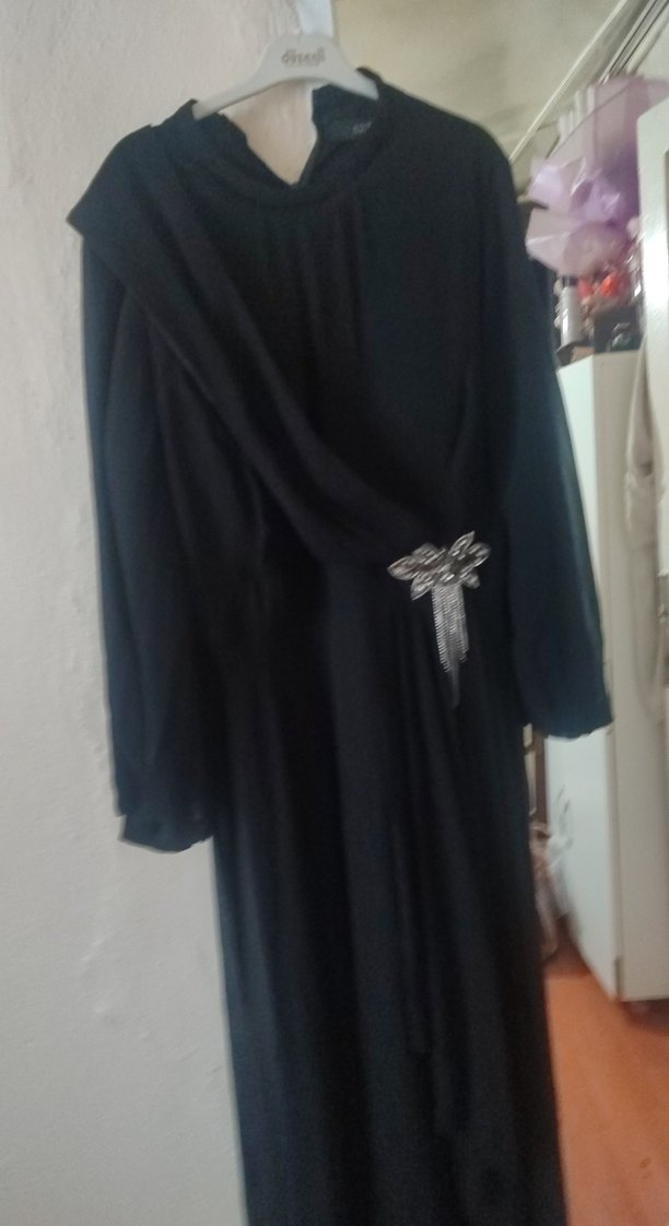 Uzun siyah renkte, bol kesim ve uzun kollu tesettür tarzda kadın elbisesidir. Dekoratif broş ile detaylandırılmıştır. iki kez kullanıldı deformesi yok