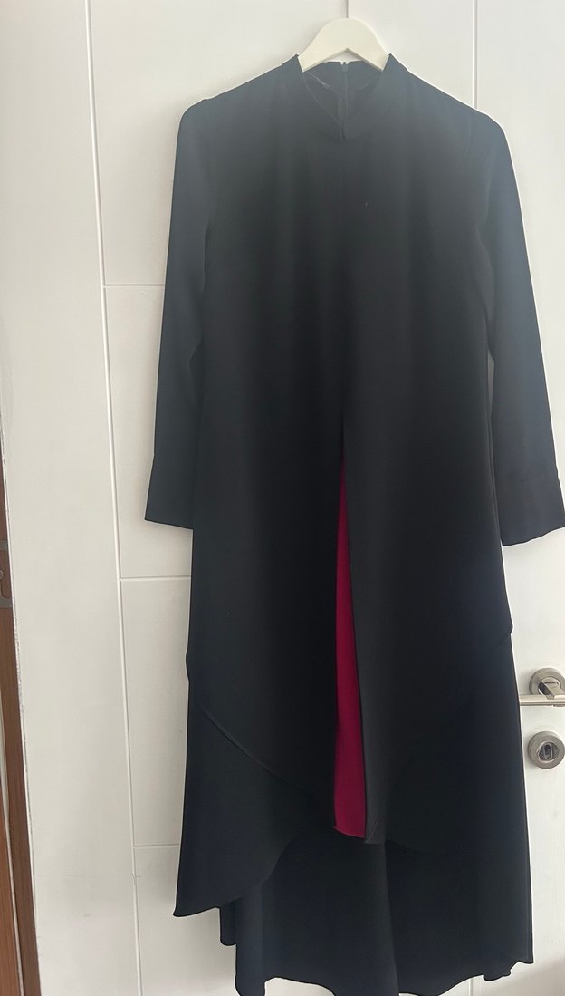Uzun siyah tesettür tunik, regular kesim ve yırtmaç detayına sahip. Notch yaka ve uzun kolludur, ofis için uygundur. Goth tarzına uygun.