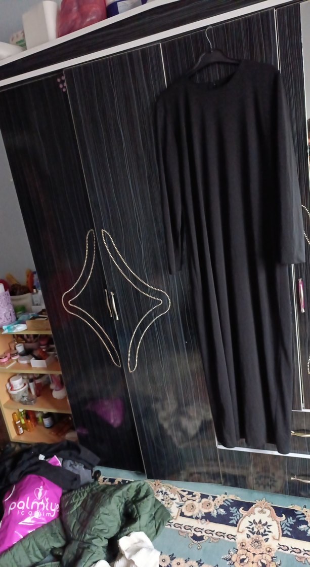 Bu uzun siyah tesetür elbise, kesik düz sade Sentetik kumaştan, regular kesim ve uzun kollu, günlük kullanım için uygundur.