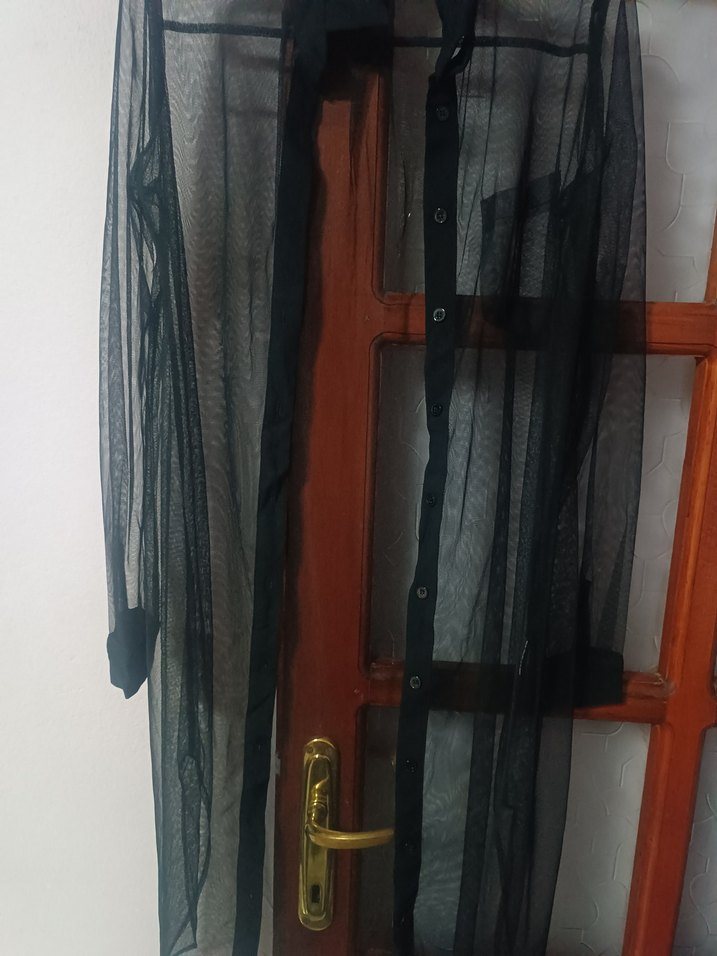 Siyah, uzun, bol kesim kadın elbise, uzun kollu ve kayık yaka. Sentetik kumaştan, drapeli, gotik tarzda, günlük kullanım için uygundur.