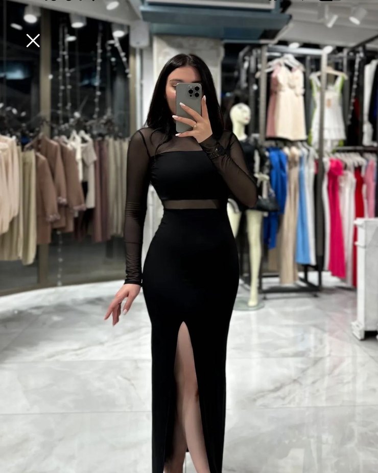 Siyah, uzun ve vücuda oturan bu elbise, transparan uzun kollu ve straplez yakaya sahiptir. Yırtmaçlı ve ipeksi dokuludur. Misswans butikten alındı.