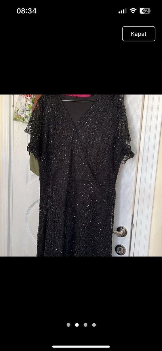 Uzun siyah V yaka kısa kollu elbise, bol kesim ve boncuk işlemeli detaylarla göz alıcı bir şıklık sunar.