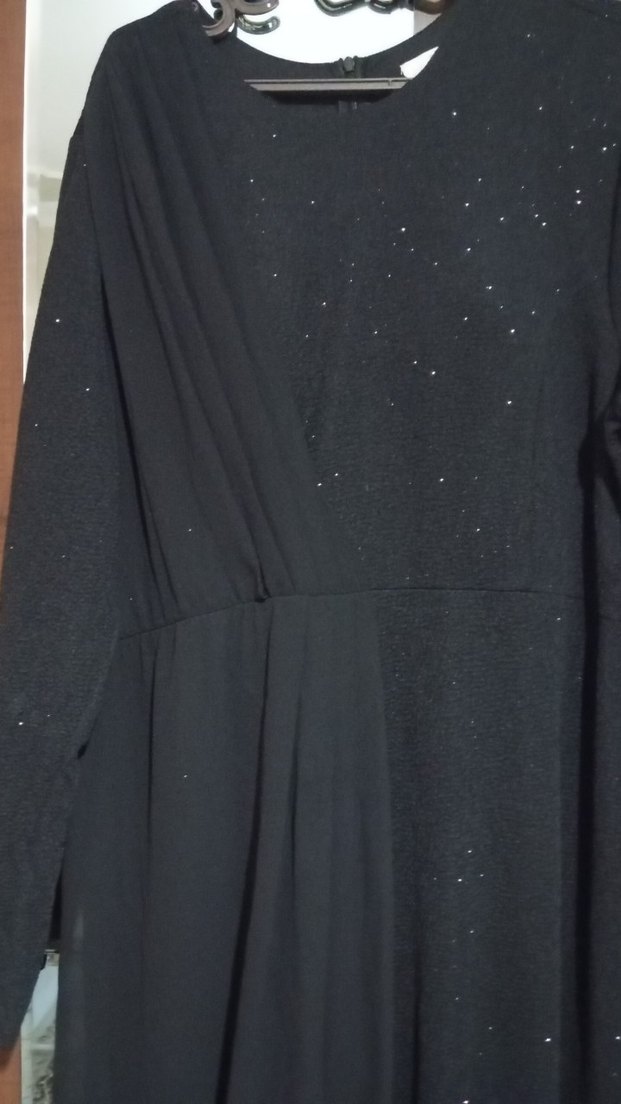 V yakalı, drapeli, uzun siyah abiye elbise, modest gotik tarzıyla romantik akşamlar için uygun.