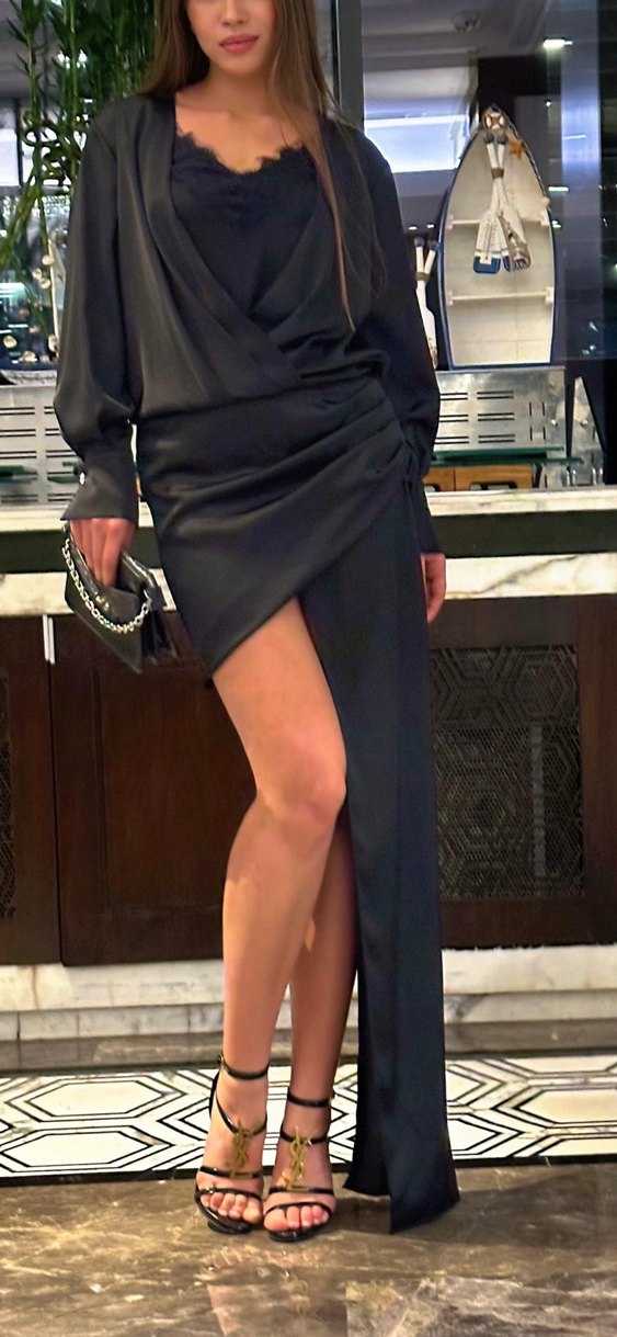 Uzun siyah abiye elbise, v yaka ve drapeli tasarımıyla dikkat çekiyor. İnce askılı kollara ve uzun kol elbise romantik akşamlar için uygun. Düğün