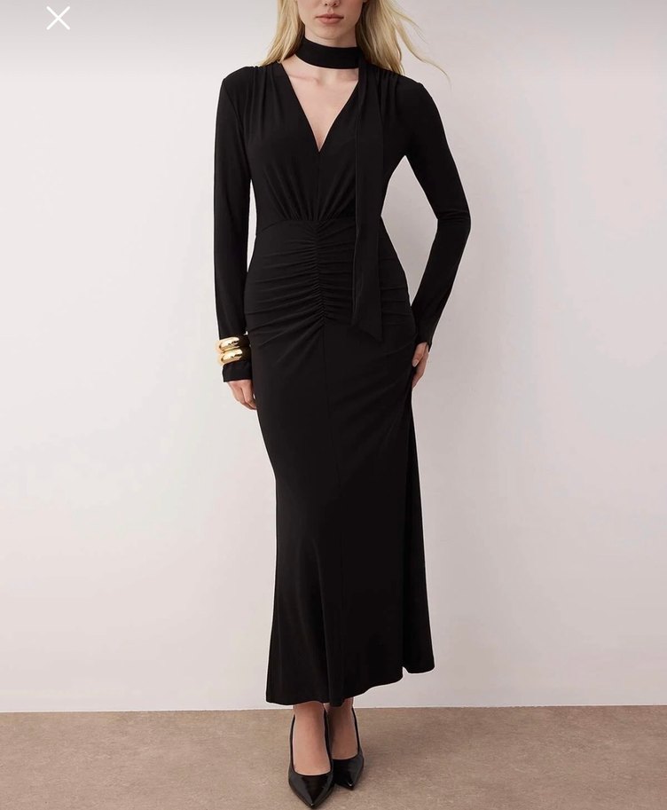 Uzun siyah elbise, V yakalı ve drapeli detaylıdır. Uzun kollu, vücuda oturan ve ipeksi dokulu, ofis için uygundur.