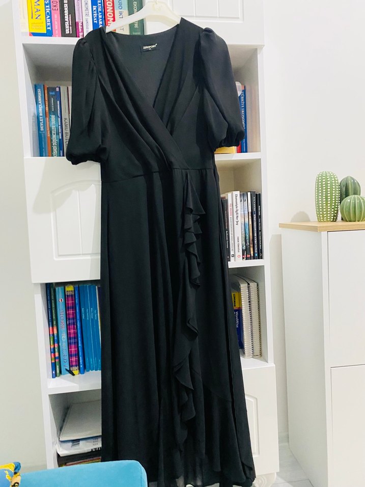 Uzun siyah elbise, V yaka ve kısa kollu, bol kesimdir. Sentetik kumaştan yapılmış, drapeli ve baskılı detaylara sahiptir, gotik tarzda ofis kullanımı için uygundur.
